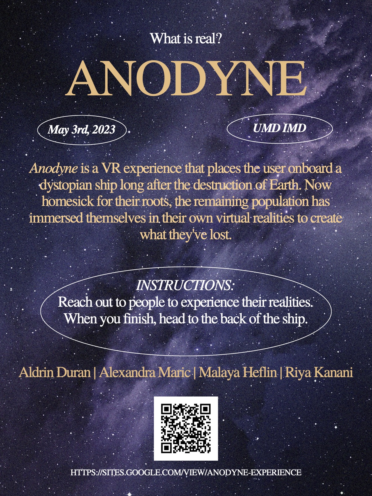Anodyne is a VR installation that my talented team and I presented at the University of Maryland’s Spring 2023 IMD showcase.