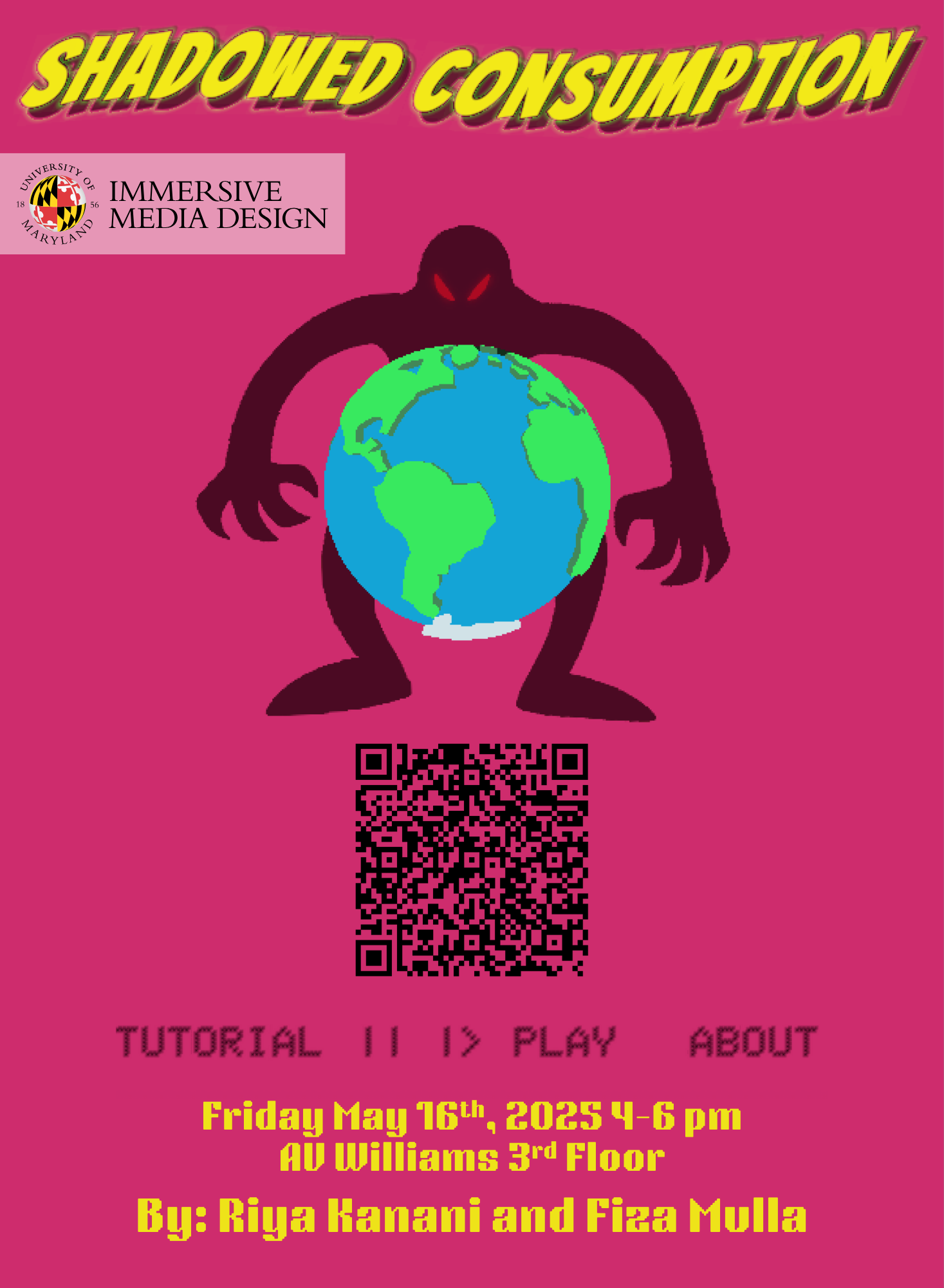 Shadowed Consumption is a single player game where the topic is on consumerism/over-consumption. The game starts with a character who goes to various shopping places. The game follows a storyline where the character is influences by firneds and a overlooming shadow to obtain popular items. After the item they want is introduced, each shopping location transforms into a platform game where the player must jump/move through platforms to get the item. The player is constantly feeling like they have to get more and more things to fit in and ultimately increase their happiness. However, the world around them slowly becomes affected by their choices and they do not see the affect it has on their own mental health.